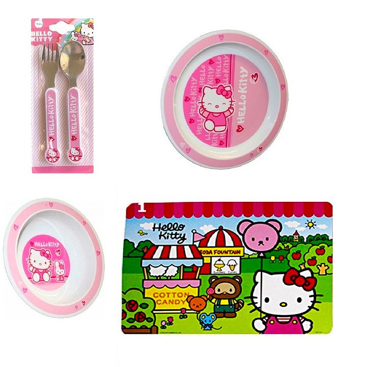 This fabulous Hello Kitty meal set comprises of a melamine plate and bowl, a metal cutlery set and a place mat