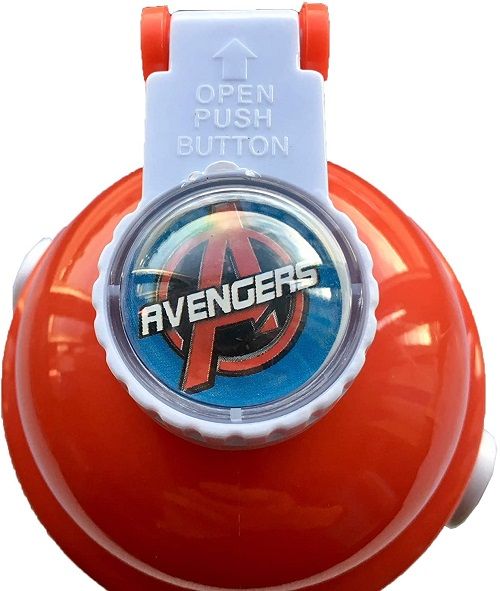 This fantastic Avengers drinks bottle is something a bit different, it has a 400ml capacity with a screw lid for filling, it also has a flip up lid activated with a push button and a pop up dispenser.